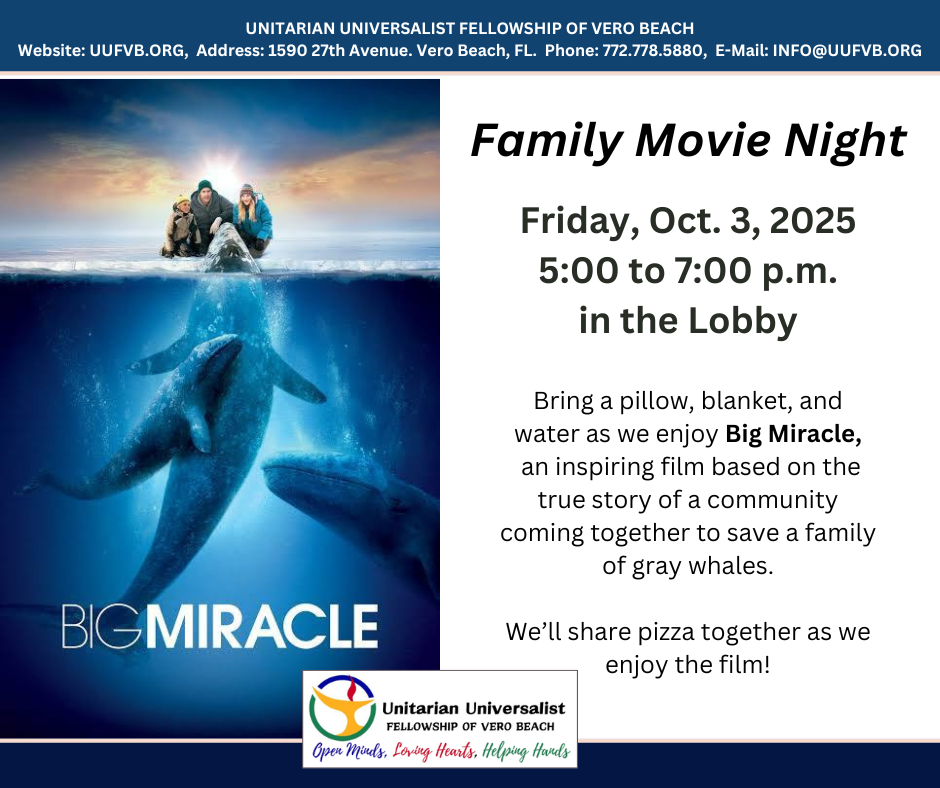Bring a pillow, blanket, and water as we enjoy Big Miracle, an inspiring film based on the true story of a community coming together to save a family of gray whales.