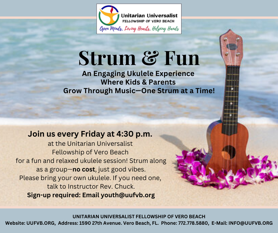 Calling all kids & parents! Join us every Friday at 4:30 PM at the Unitarian Universalist Fellowship of Vero Beach for a fun and relaxed ukulele session. No cost—just good vibes!