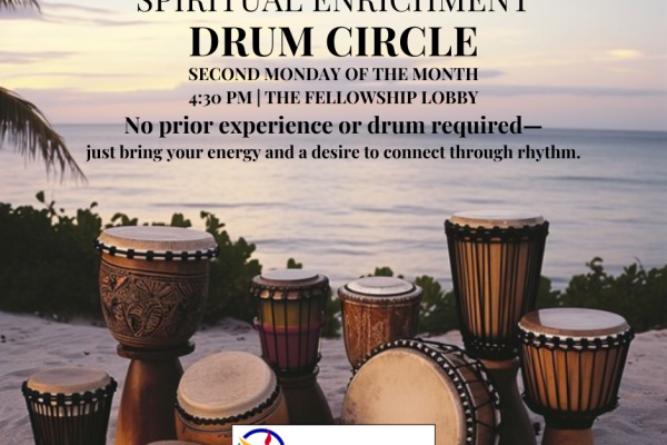 Join the Spiritual Enrichment Drum Circle every second Monday of the month at 4:30 p.m. at the Unitarian Universalist Fellowship of Vero Beach. No experience or drum is needed—just bring your spirit and energy.