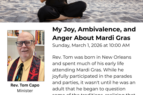 My Joy, Ambivalence, and Anger About Mardi Gras – Rev. Tom Capo | March 1, 2026 Rev. Tom was born in New Orleans and spent much of his early life attending Mardi Gras. While he joyfully participated in the parades and parties, it wasn’t until he was an adult that...