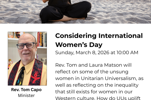 Considering International Women’s Day – Rev. Tom Capo | March 8, 2026 Rev. Tom and Laura Matson will reflect on some of the unsung women in Unitarian Universalism, as well as reflecting on the inequality that still exists for women in our Western culture. How do UUs uplift women? How...