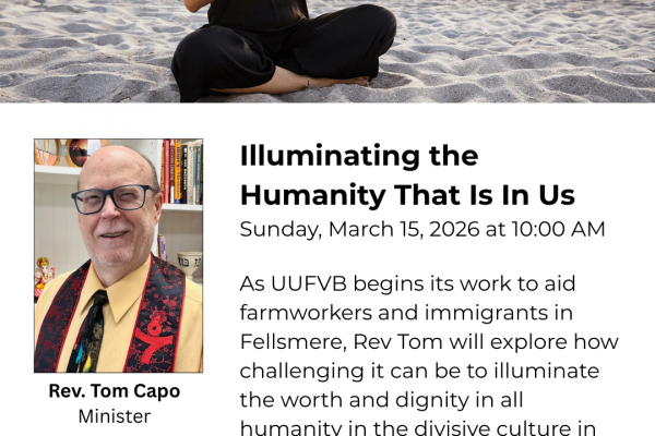 Illuminating the Humanity That Is In Us All – Rev. Tom Capo | March 15, 2026 As UUFVB begins its work to aid farmworkers and immigrants in Fellsmere, Rev Tom will explore how challenging it can be to illuminate the worth and dignity in all humanity in the divisive culture...