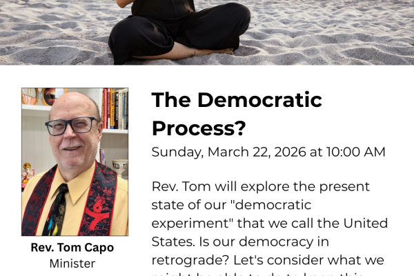 The Democratic Process? – Rev. Tom Capo | March 22, 2026 Rev. Tom will explore the present state of our “democratic experiment” that we call the United States. Is our democracy in retrograde? Let’s consider what we might be able to do to keep this experiment thriving.