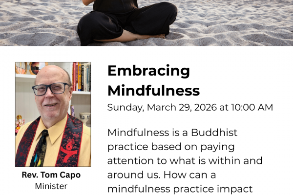 Embracing Mindfulness – Rev. Tom Capo | March 29, 2026 Mindfulness is a Buddhist practice based on paying attention to what is within and around us. How can a mindfulness practice impact one’s health, resilience, and justice work?