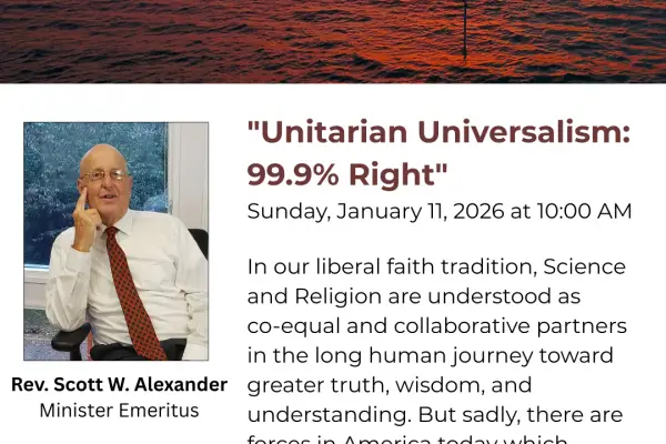 “Unitarian Universalism: 99.9% Right” – Rev. Scott W. Alexander | January 11, 2026 In our liberal faith tradition, Science and Religion are understood as co-equal and collaborative partners in the long human journey toward greater truth, wisdom, and understanding. But sadly, there are forces in America today which threaten this...