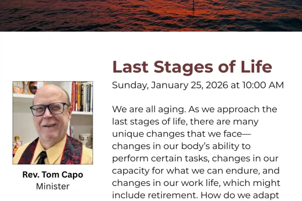The Last Stages of Life – Rev. Tom Capo| January 25, 2026 We are all aging. As we approach the last stages of life, there are many unique changes that we face—changes in our body’s ability to perform certain tasks, changes in our capacity for what we can endure, and...