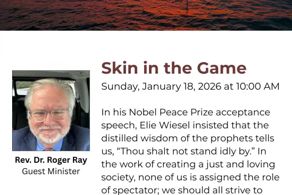 Skin in the Game – Rev. Dr. Roger Ray| January 18, 2026 In his Nobel Peace Prize acceptance speech, Elie Wiesel insisted that the distilled wisdom of the prophets tells us, “Thou shalt not stand idly by.” In the work of creating a just and loving society, none of us...