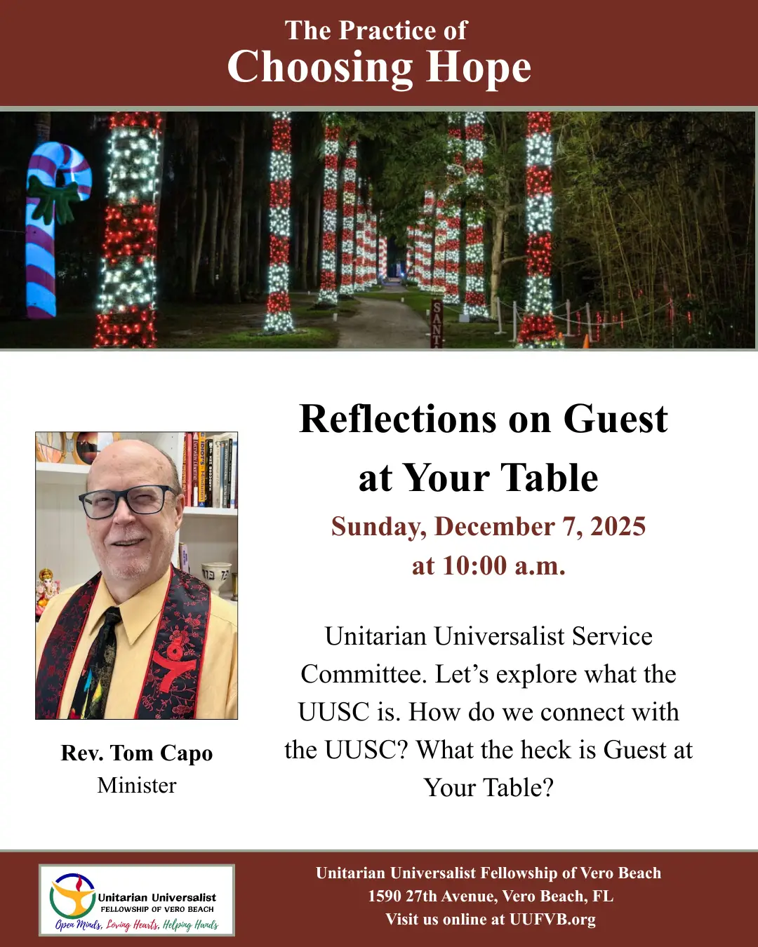 Event details 07-Dec-2025 10:00 Reflections on Guest at Your Table – Rev. Tom Capo | December 7, 2025 Unitarian Universalist Service Committee. Let’s explore what the UUSC is. How do we connect with the UUSC? What the heck is Guest at Your Table? Save Event to Calendar Save to iCalendar Save to Google Calendar Save to Outlook Save to Yahoo! Calendar