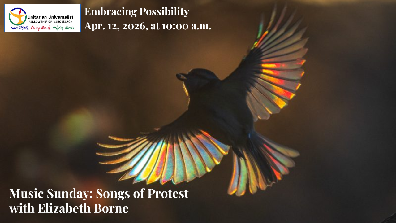 Event details 12-Apr-2026 10:00 Music Sunday: Songs of Protest – Elizabeth Borne | April 12, 2026 Come hear some rousing protest songs! Feel energized to continue working toward a better, more just world. Save Event to Calendar Save to iCalendar Save to Google Calendar Save to Outlook Save to Yahoo! Calendar