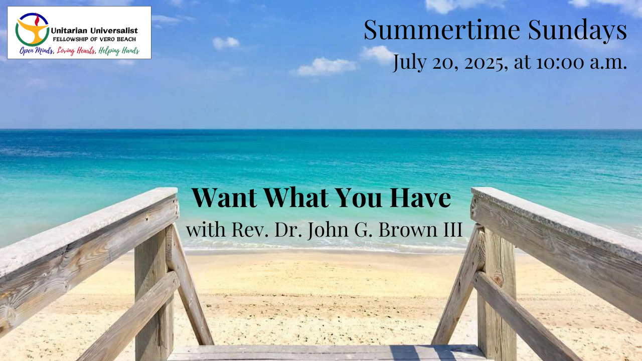 Originally written by Rev. Dr. Forrest Church, beloved former pastor of All Souls Unitarian Church in New York City, “Want What You Have” offers a timeless message about gratitude, perspective, and finding meaning in the present moment. Though written years ago, Dr. Church’s words continue to resonate in today’s complex world. Rev. Dr. Brown will reflect on and expand upon these caring and insightful themes, offering his own interpretation and connection to our current lives.
