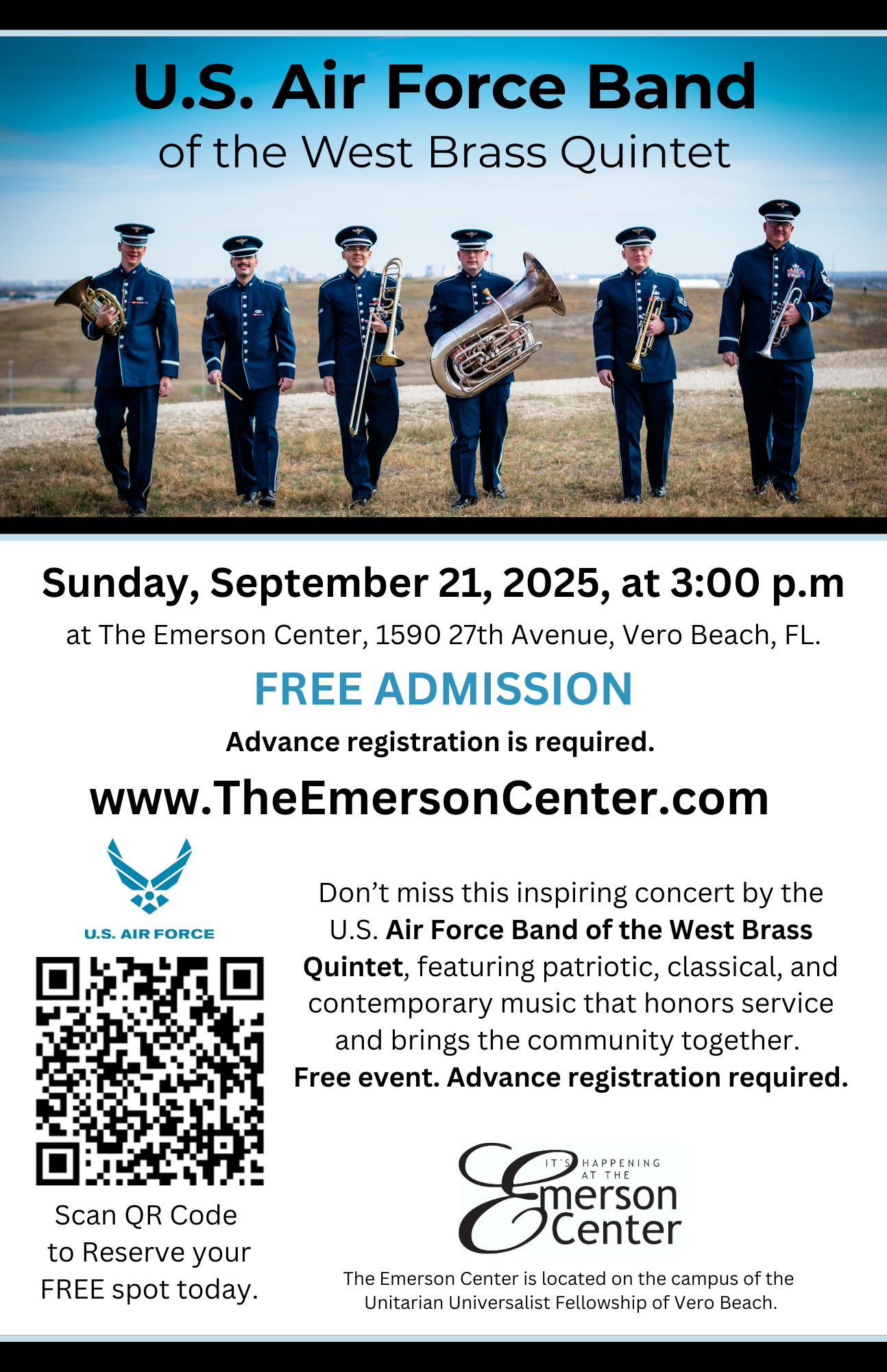 The Emerson Center proudly welcomes the U.S. Air Force Band of the West Brass Quintet for a special live performance that brings the spirit of service and the power of music together in one unforgettable event. This premier ensemble, composed of six highly accomplished Airmen Musicians, showcases the United States Air Force’s commitment to excellence through a dynamic and uplifting concert.