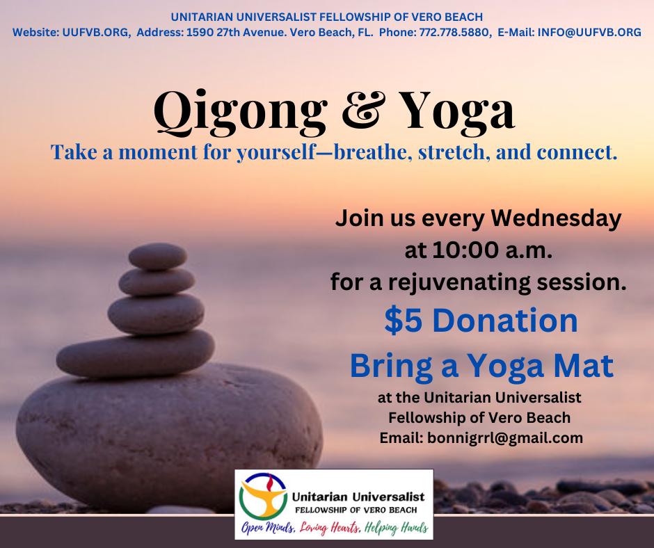 Posted on 29-Jan-2026 Posted By: Kelly Stephens Categories: Uncategorized Join us every Wednesday at 10 a.m. for Qigong and Yoga at the Unitarian Universalist Fellowship of Vero Beach.A $5 donation is appreciated. Don’t forget to bring your yoga mat!