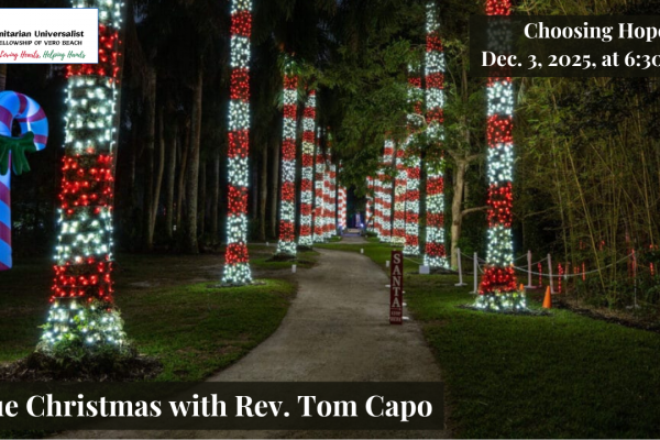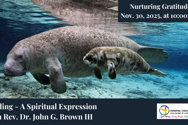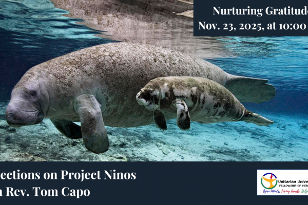 Rev. Tom is setting aside this service for us to remember the members and friends of UUFVB whom we have lost this year. Please bring any pictures, memorabilia, or remembrances you wish to share. You will have an opportunity to share them during the service.
